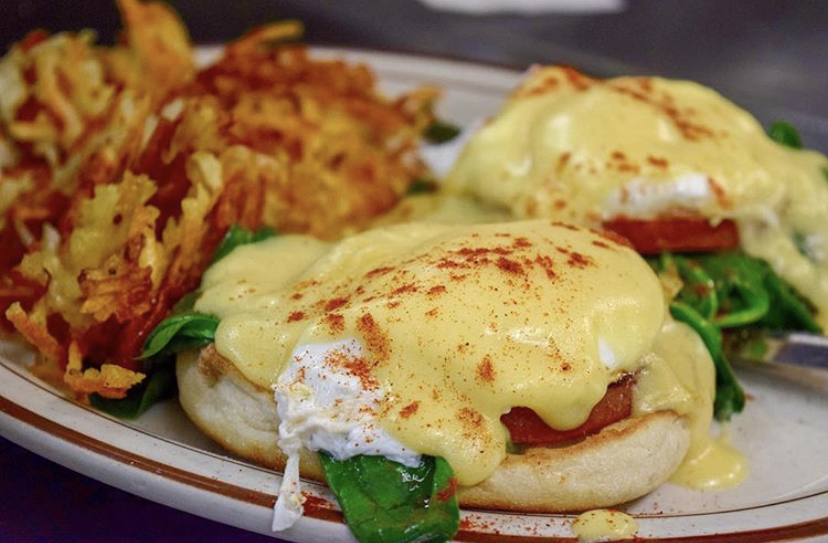 2 lightly Poached Eggs with grilled Canadian Bacon and Spinach atop a Toasted English Muffin with Hollandaise Sauce and Hash Browns or Home Fries.